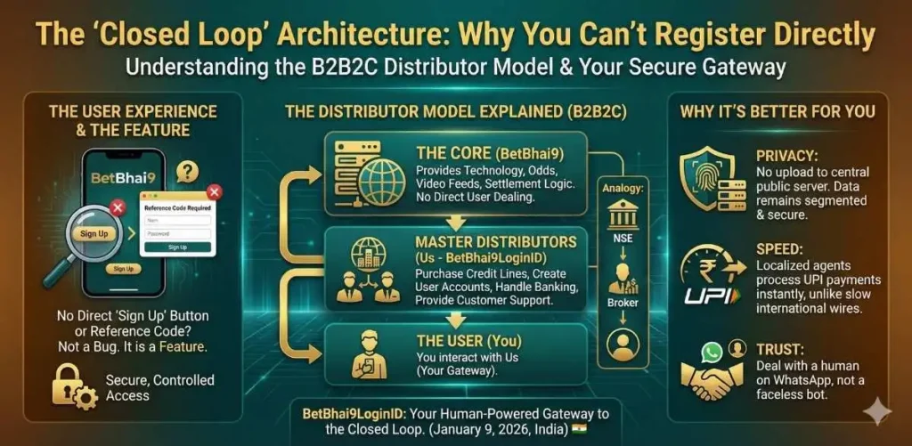 The Distributor Model Explained BetBhai9 operates on a B2B2C (Business to Business to Consumer) model, similar to how the Stock Exchange works. You cannot walk into the NSE (National Stock Exchange) and buy a share; you need a Broker.